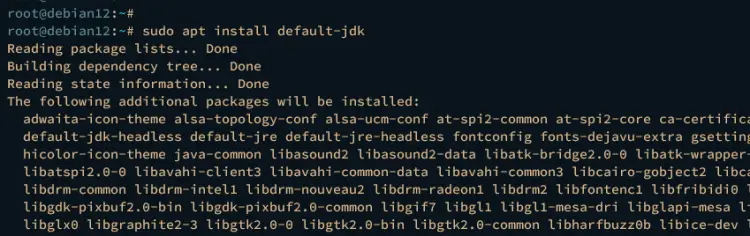 Теперь установите Java OpenJDK 17, выполнив команду ниже. В репозитории Debian 12 пакет default-jdk относится к Java OpenJDK 17, который требуется Neo4j Graph Database.