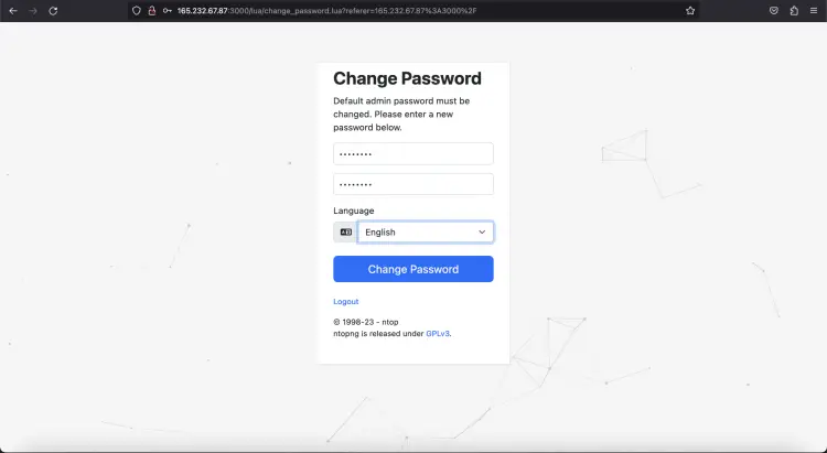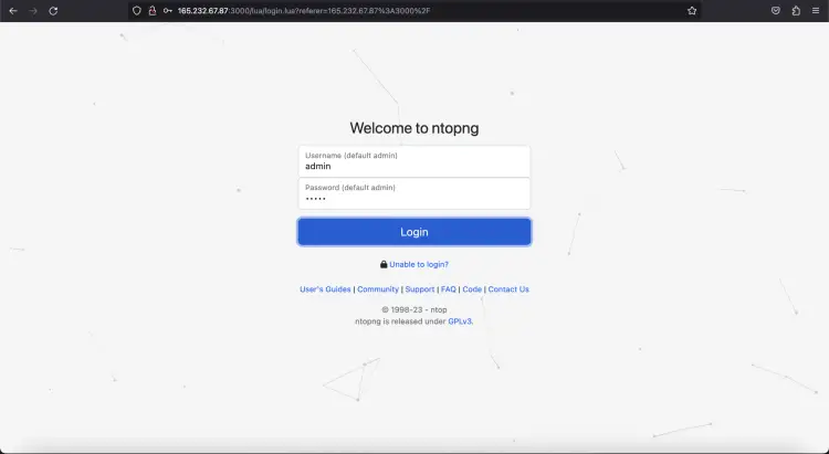 Откройте веб-браузер и напишите URL http://your-server-ip:3000. Обратите внимание, что вам нужно заменить IP-адрес вашей системы, а затем номер порта, и вы будете перенаправлены на страницу входа в Ntopng: